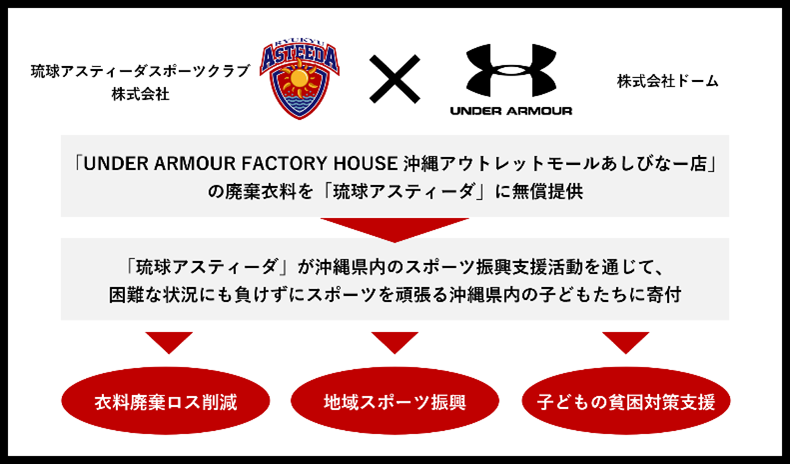 米スポーツアパレル「UNDER ARMOUR(アンダーアーマー)」の衣料廃棄ロス削減とスポーツ振興を通じて沖縄県内の子どもの貧困対策支援を目的とした寄付活動。2021年春にUNDER ARMOUR日本総代理店の株式会社ドームと開始。「UNDER ARMOUR FACTORY HOUSE 沖縄アウトレットモールあしびなー店」で販売を終了した商品を沖縄県内の子どもたちやその家族に寄付提供することで、サステナブルな社会貢献に繋げることを目指します。