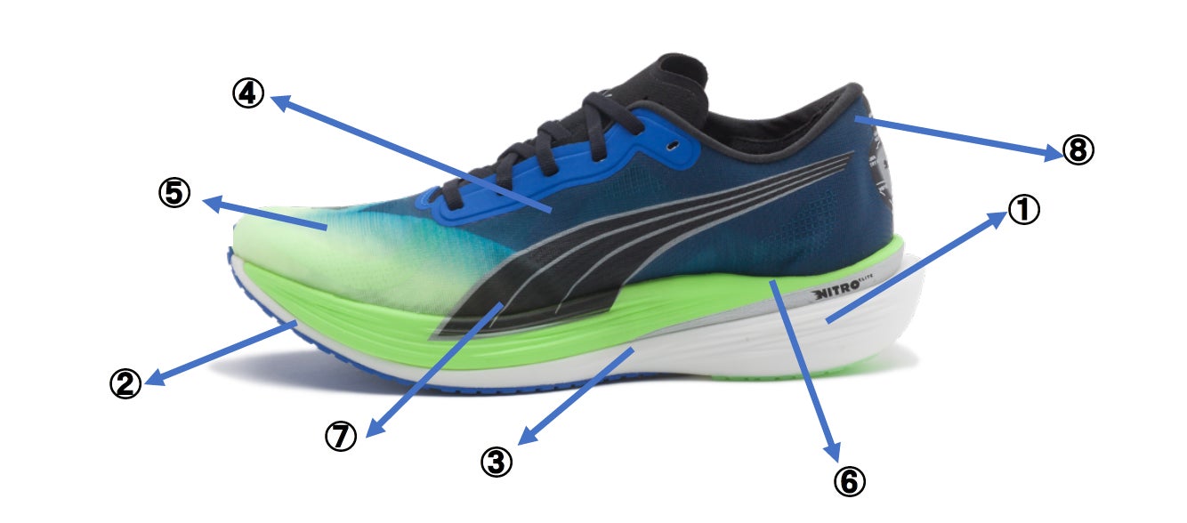 ①NITRO ELITE FOAM(ニトロ エリート フォーム):1秒でも早く走るために開発されたプーマ史上最高の推進力と反発力を生むテクノロジー
