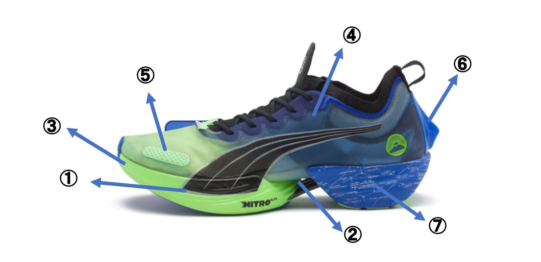 ① NITRO ELITE FOAM(ニトロ エリート フォーム):1秒でも早く走るために開発されたプーマ史上最高の推進力と反発力を生むテクノロジー
