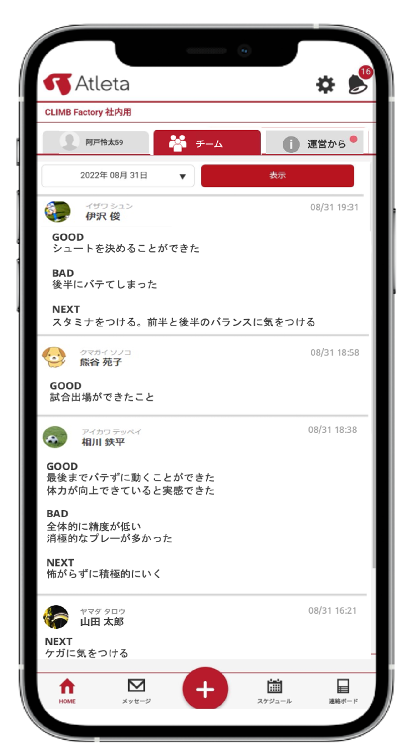 株式会社エムティーアイが提供する、スポーツチームをサポートするコンディショニングノート『Atleta(アトレータ)』は、12月14日(水)より、チームメイトの振り返り記録を閲覧することでコンディションや考えを知ることができる「チーム機能」を追加します。