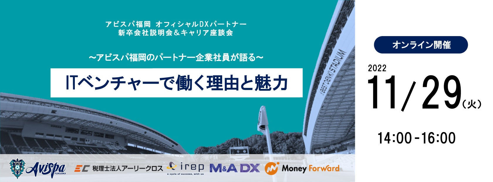 アビスパ福岡オフィシャルDXパートナーである株式会社マネーフォワード、税理士法人アーリークロス、株式会社アイレップ、株式会社M&A DXの4社合同で、オンラインにて会社説明会と「~アビスパ福岡のパートナー企業社員が語る~ITベンチャーで働く理由と魅力」をテーマとしたキャリア座談会を開催致しました。オンラインでの開催だったこともあり、福岡県内だけでなく全国各地の学生の皆様にご参加頂きました。