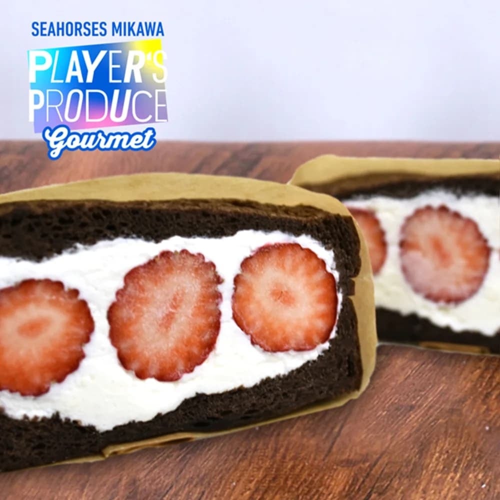 大変お待たせいたしました。#7 長野誠史選手のパン祭り第2弾!昨シーズン大好評だった「苺ぎゅんぎゅんサンド」がさらに美味しくなって登場!大粒な苺がぎゅんぎゅん♪甘さ控えめなホイップとカカオパンでサンドしました。これを食べてブルークリスマスを盛上げましょう!!