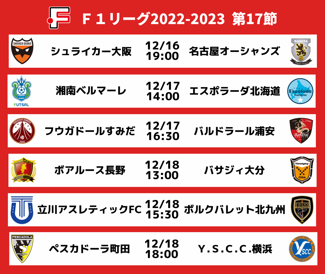 12月16日(金)~18日(日)にFリーグ2022-2023 ディビジョン1 第17節の6試合を開催いたします。