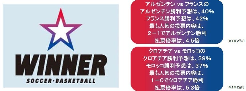 ※3 「WINNERサッカー1試合予想」のうち、フランスおよびモロッコが勝利する投票内容(No.8~No.14)に投票された割合の合計です。なお、投票内容は90分間の試合結果の予想となります。延長の結果は含まれません。