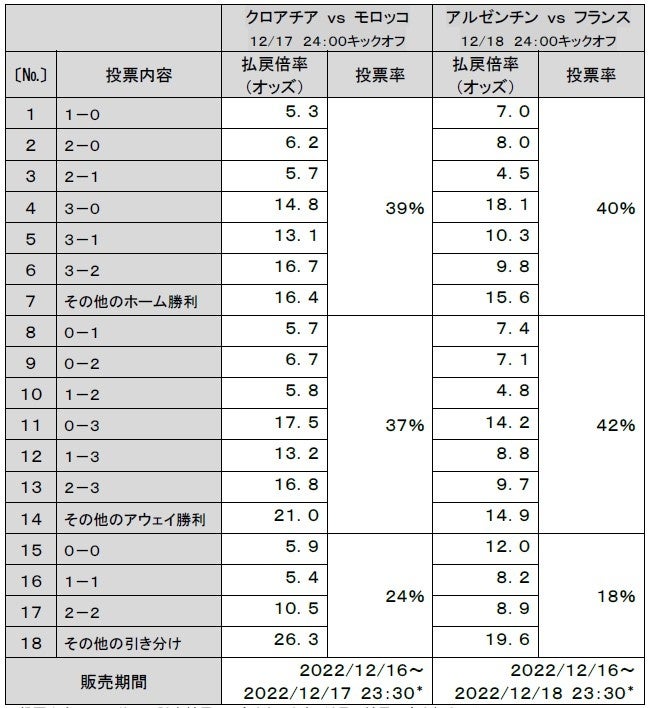 ※1 12月16日(金)12時時点の投票状況となります。払戻倍率(オッズ)は、投票状況により販売終了まで変動します。払戻倍率(オッズ)は、スポーツくじオフィシャルサイト(https://www.toto-dream.com/)で随時更新しています。