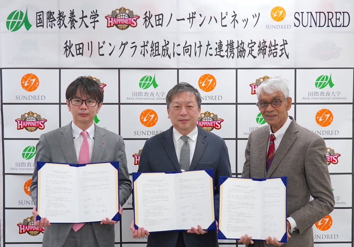秋田ノーザンハピネッツ株式会社(所在地:秋田県秋田市、代表取締役社長:水野 勇気、以下:秋田ノーザンハピネッツ)は、100個の新産業の共創を目指す「新産業アクセラレーター」SUNDRED株式会社(所在地:東京都渋谷区、代表取締役:留目 真伸、以下:SUNDRED)、公立大学法人 国際教養大学(所在地:秋田県秋田市、理事長・学長:モンテ・カセム、以下:AIU)とともに新産業の創出を通じて秋田を活性化する目的で、秋田リビングラボの組成に向けて協調して活動を行っていく連携協定を2022年12月16日(金)に締結しましたのでお知らせいたします。