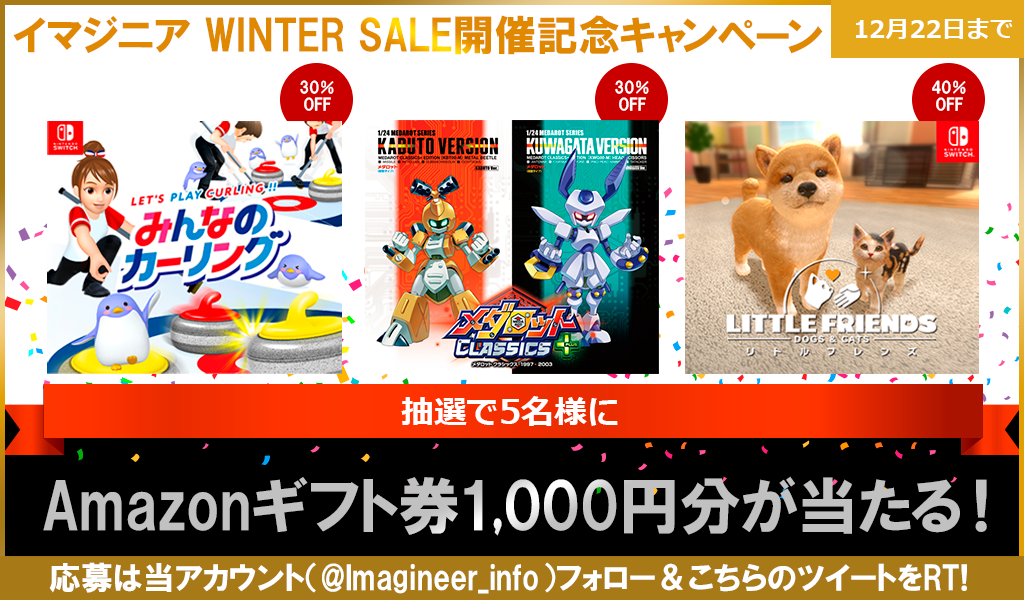 イマジニア WINTER SALE開催を記念して、Amazonギフト券1,000円分が5名に当たる、Twitterキャンペーンを開催します。詳細はイマジニア公式Twitterにてご確認ください。
