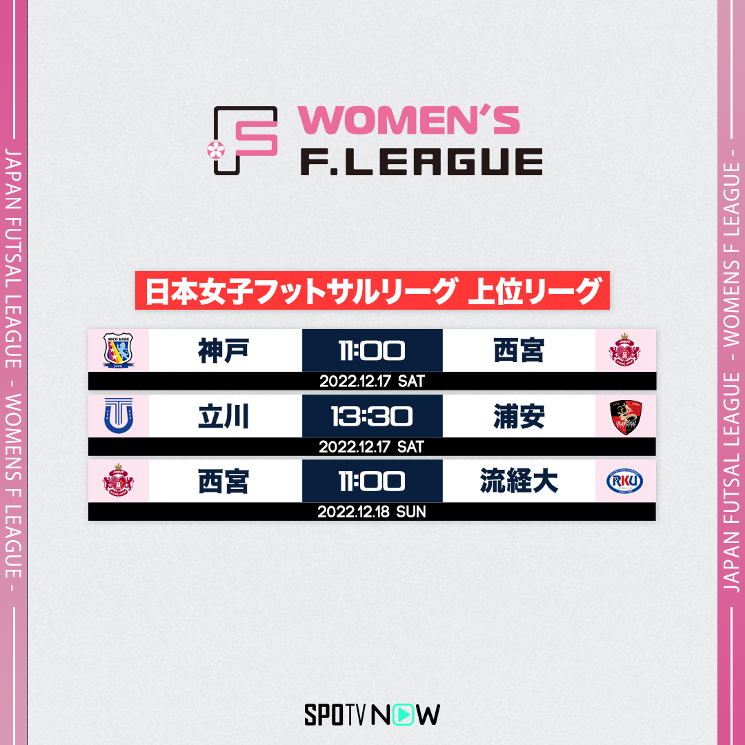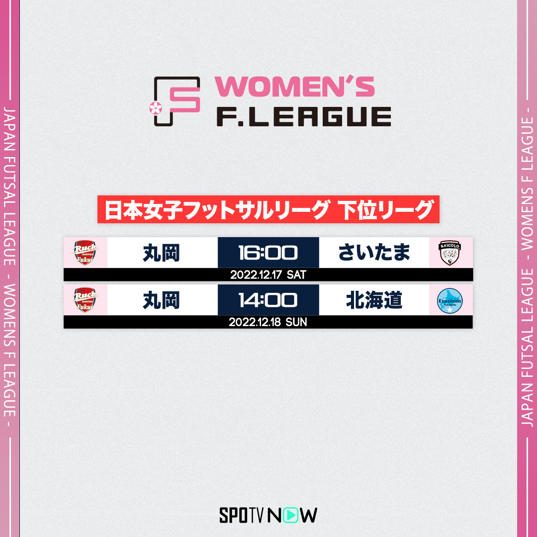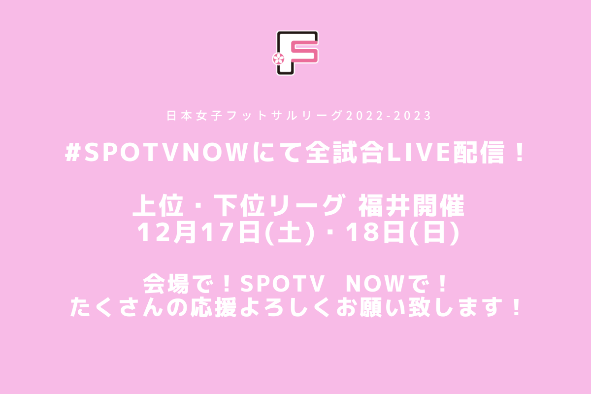 12月17日(土)、18日(日)に、福井県営体育館にて日本女子フットサルリーグ2022-2023 上位・下位リーグを開催します。今シーズンもSPOTV NOW(登録・視聴無料)にて全試合をライブ配信いたしますので、ぜひご視聴ください!