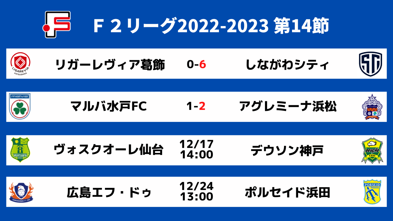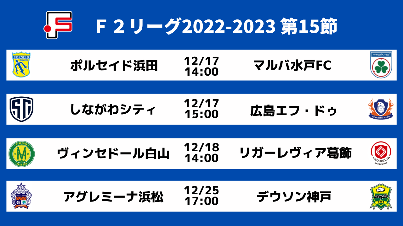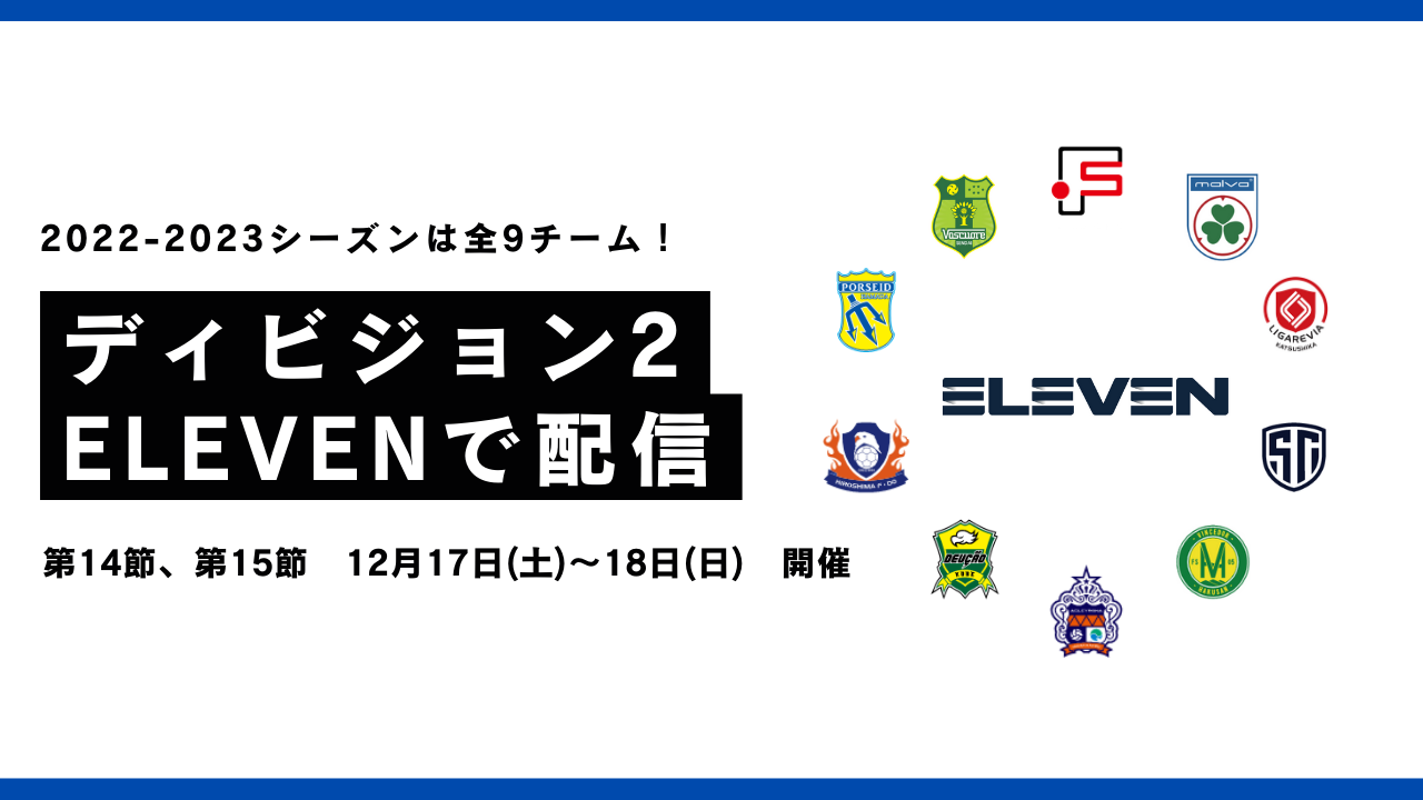 12月17日(土)、18日(日)に開催するFリーグ2022-2023 ディビジョン2 第14節の1試合、第15節の3試合を以下の通り、ELEVENにてライブ配信いたします!全試合を無料でご視聴いただけますので、ELEVENのアプリをダウンロードいただき、ぜひご視聴ください!