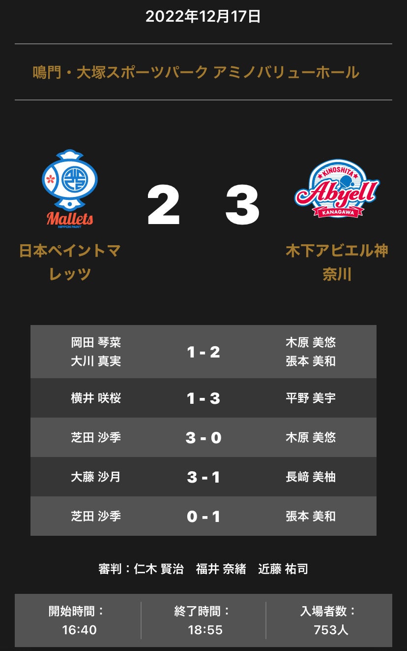 日本ペイントマレッツ vs 木下アビエル神奈川の試合結果は