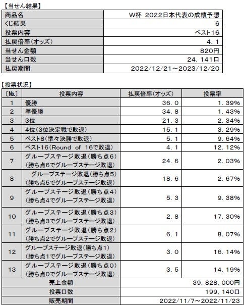 ・日本代表の成績は「ベスト16」となり、払戻倍率(オッズ)は4.1倍、当せん金額は820円となりました。
