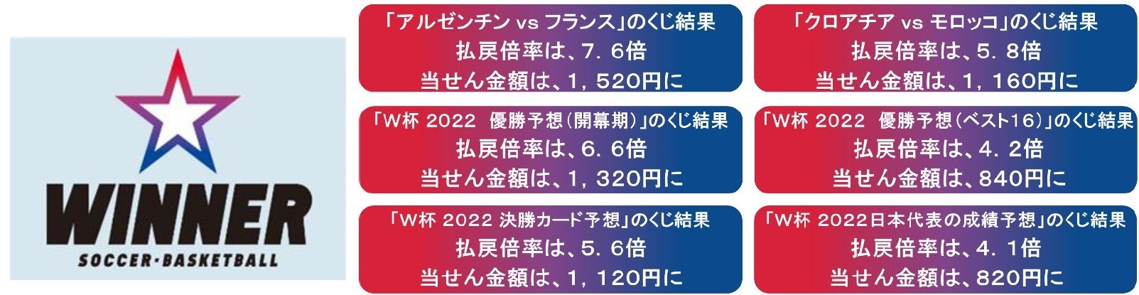 なお、サッカーワールドカップを対象とした「WINNER」の販売は終了しましたが、「WINNER」は、J.LEAGUEやB.LEAGUEの試合でもお楽しみいただけます。1試合予想や競技会の結果などが予想できる「WINNER」を今後もぜひお楽しみください。