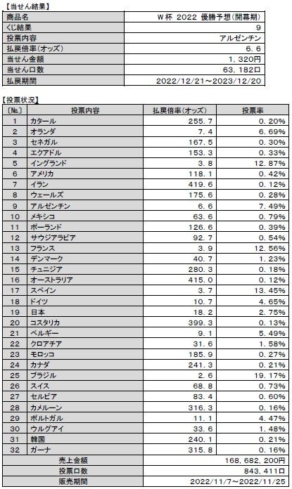 - 「W杯 2022 優勝予想(開幕期)」のくじ結果