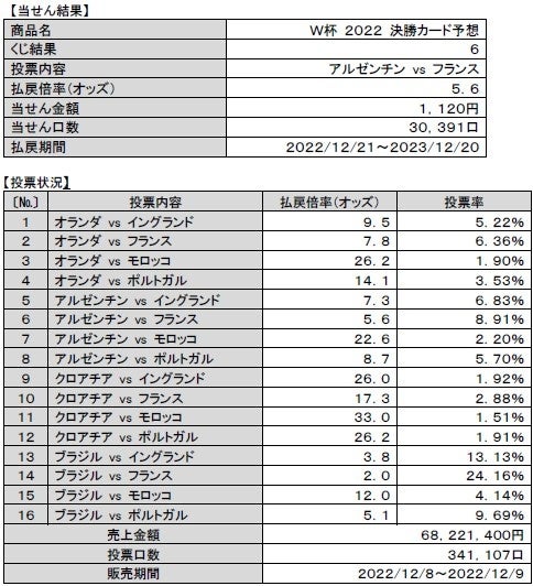 ・決勝「アルゼンチン vs フランス」の対戦は、2-2で引き分けとなり、払戻倍率(オッズ)は7.6倍、当せん金額は1,520円となりました。