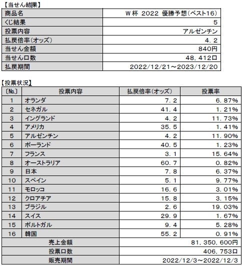 全16選択肢のうち最も多かった投票内容は、「ブラジル」の優勝、払戻倍率(オッズ)は2.6倍となった中、3番目に投票の多かった結果となりました。