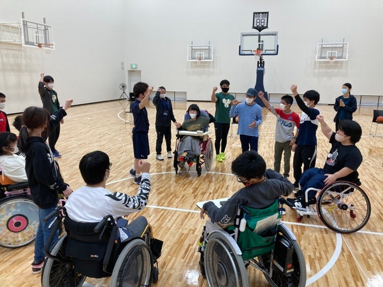 12月16日(金)に沖縄アリーナにて沖縄県立鏡ヶ丘特別支援学校の生徒14名とキングスのバスケスクールコーチやマスコットのゴーディーとの交流会を実施しました。