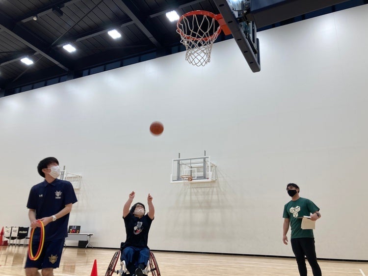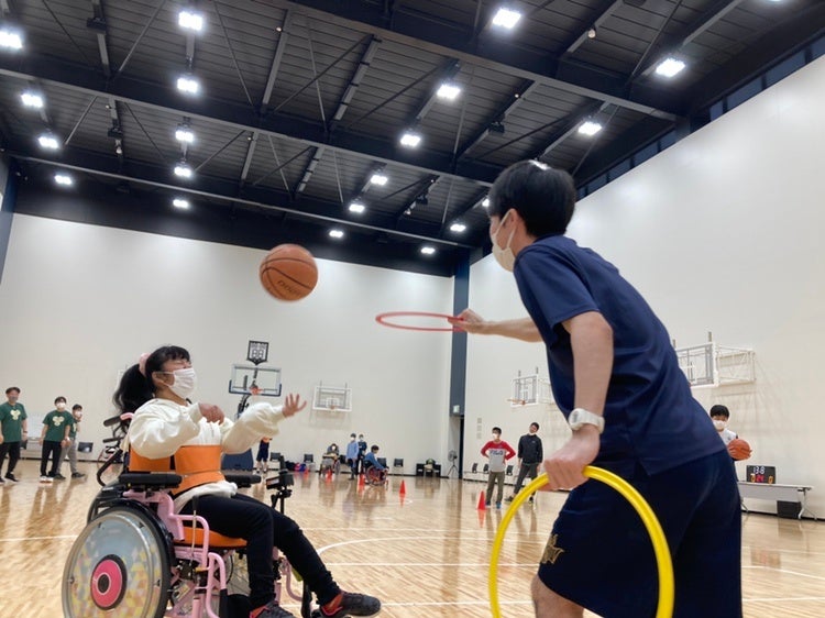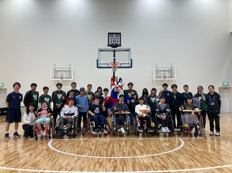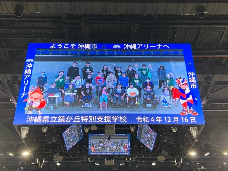 12月16日(金)に沖縄アリーナにて沖縄県立鏡ヶ丘特別支援学校の生徒14名とキングスのバスケスクールコーチやマスコットのゴーディーとの交流会を実施しました。