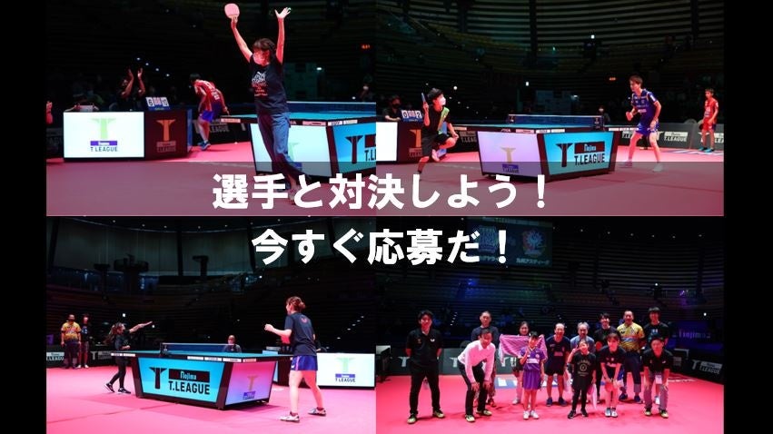 対戦は、各試合の前に、実際にその後の公式戦で使用される本番台にて実施され、Tリーグ選手vs当選者のファンの皆さまのチームで、11点先取の1ゲームマッチでの対戦となります。(ファンの皆様のチームは1球ごと順番に交代とさせていただきます)