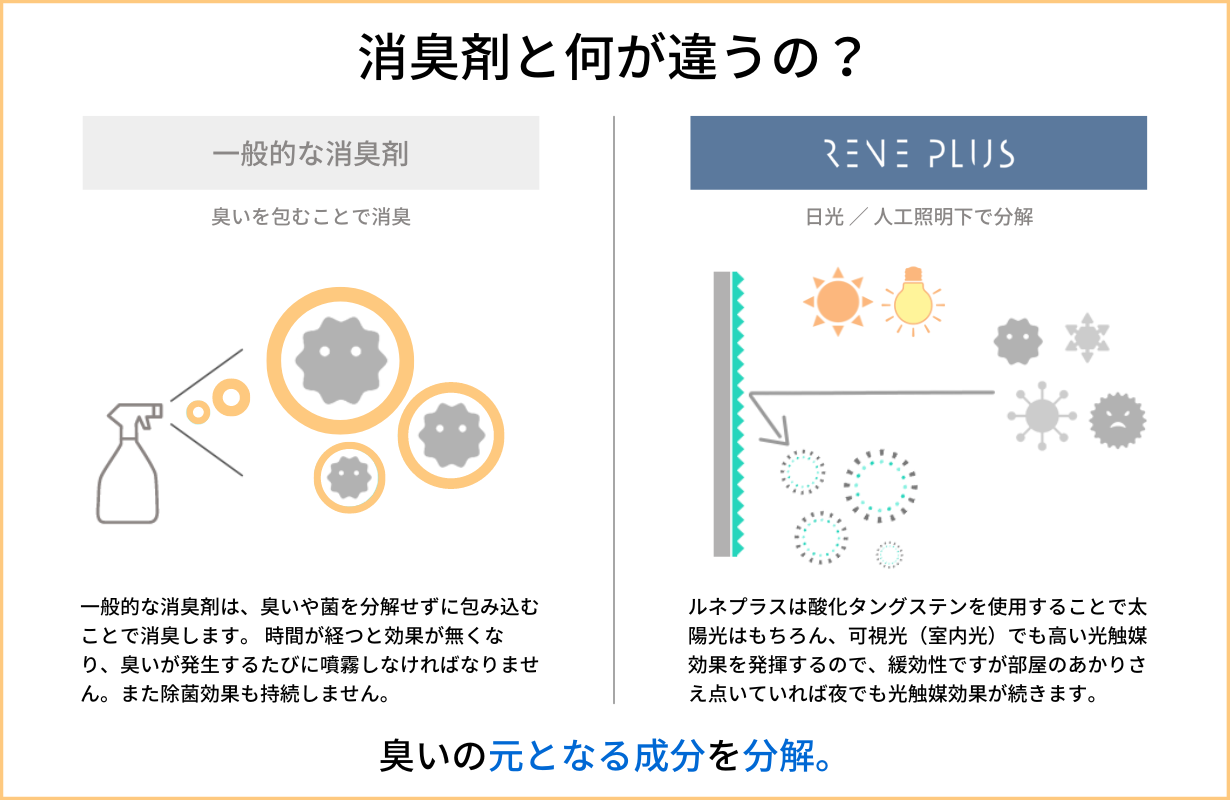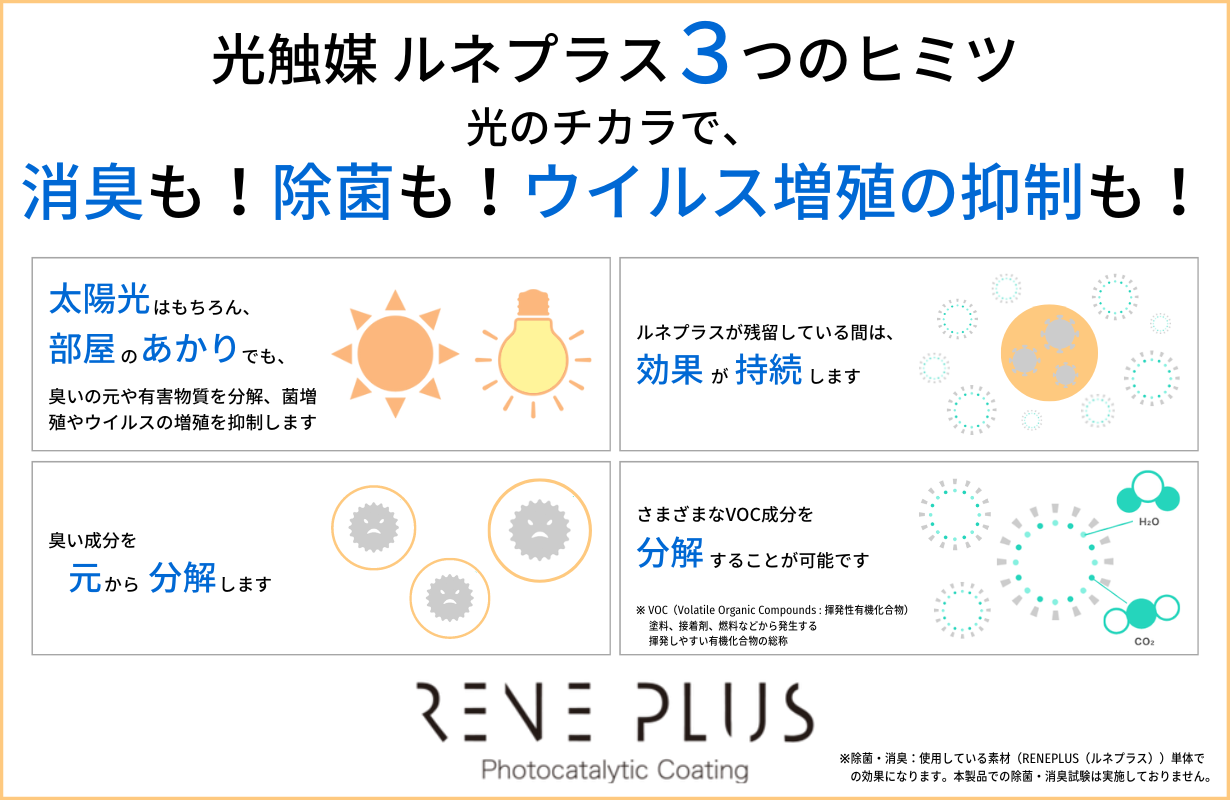 TOSHIBAとケミカルテクノロジー社が開発した光触媒「RENEPLUS(ルネプラス)」をTRUNK LONG SLEEVEの生地に施しています。