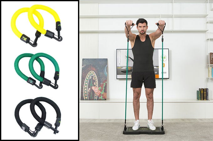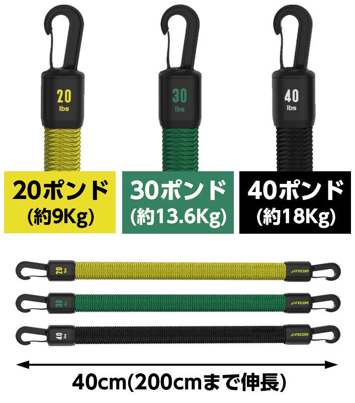 レジスタンスバンドは、20ポンド(約9Kg)、30ポンド(約13.6Kg)、40ポンド(約18Kg)までの抵抗がある3種類のバンドを採用しました。