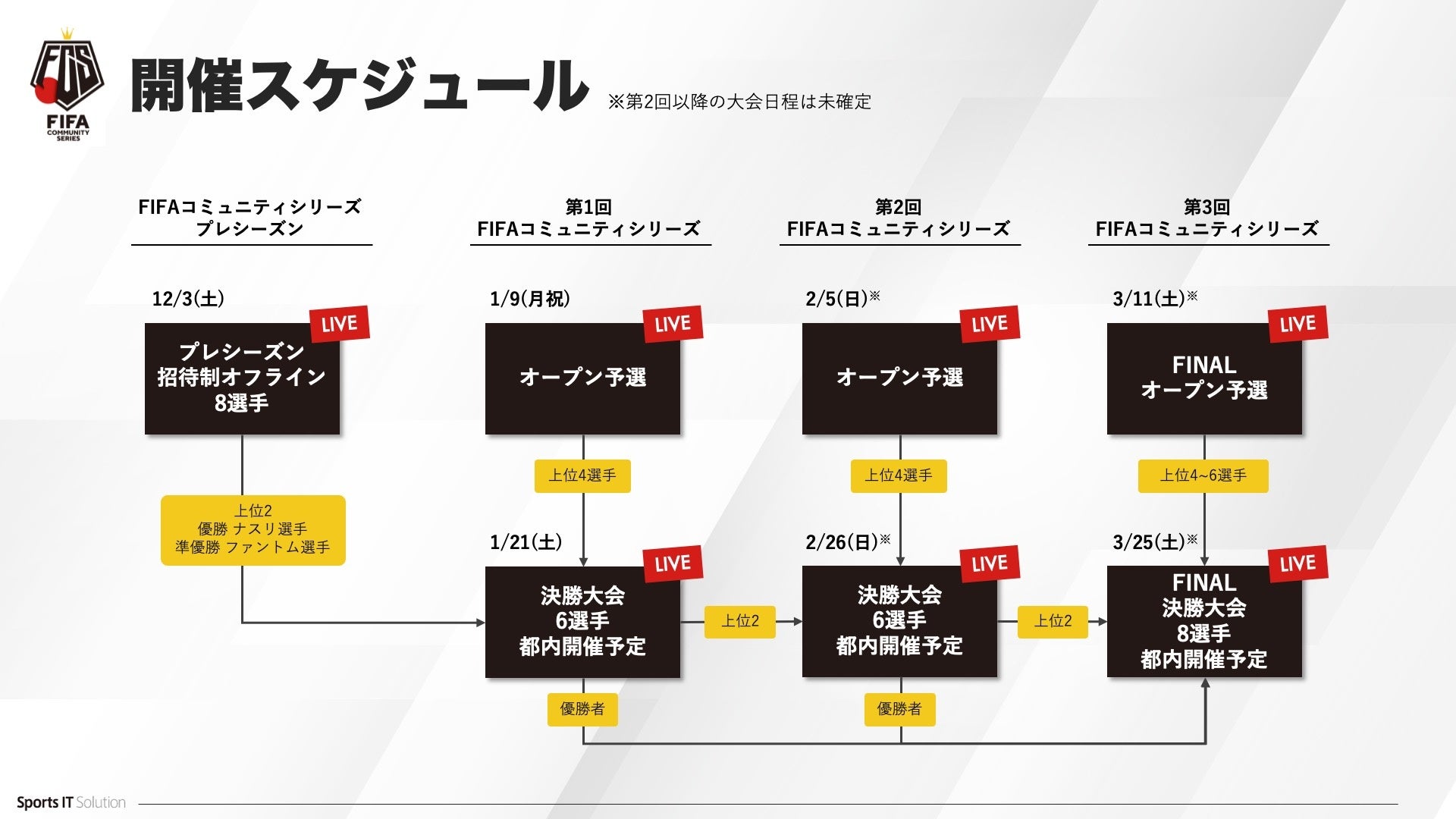 『FIFAコミュニティシリーズ23』はこの課題に対応し、来年1月より定期的な大会を開催していきます。オンラインにてどなたでも参加できる「オープン予選」、オープン予選にて上位に入賞した選手および前回大会で優秀な成績を修めたトップ数選手のみが参加できる「オフライン決勝大会」の2つで1大会が構成され、そのどちらも大会公式にてライブ配信を行います。現時点では3月までの大会開催を予定しています。