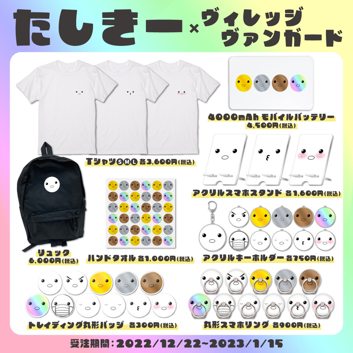 たしきーの顔ロゴ入りTシャツやスマホスタンドなど、沢山のグッズをご用意いたしました。