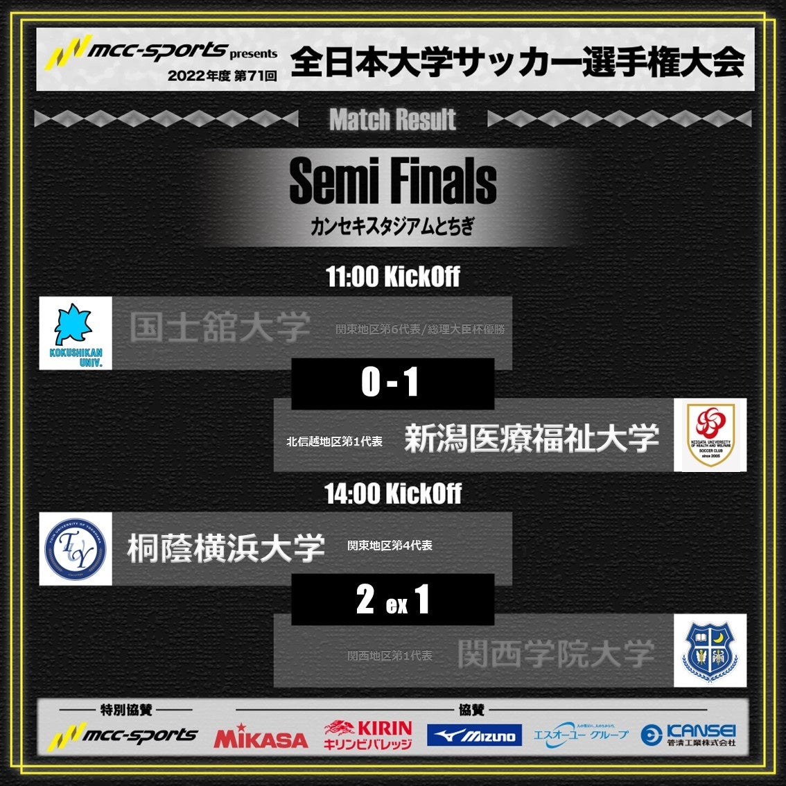 大学サッカーの日本一を決める『MCCスポーツpresents 2022年度 第71回 全日本大学サッカー選手権大会』の準決勝。来年1月1日に国立競技場で行われる決勝進出を懸け、は国士舘大学と新潟医療福祉大学、そして桐蔭横浜大学と関西学院大学が対戦した。国立行きの切符を手にしたのは、勝てばどちらも初優勝となる2チーム。国立復帰初戦にふさわしく、決勝はフレッシュな対戦カードとなった。