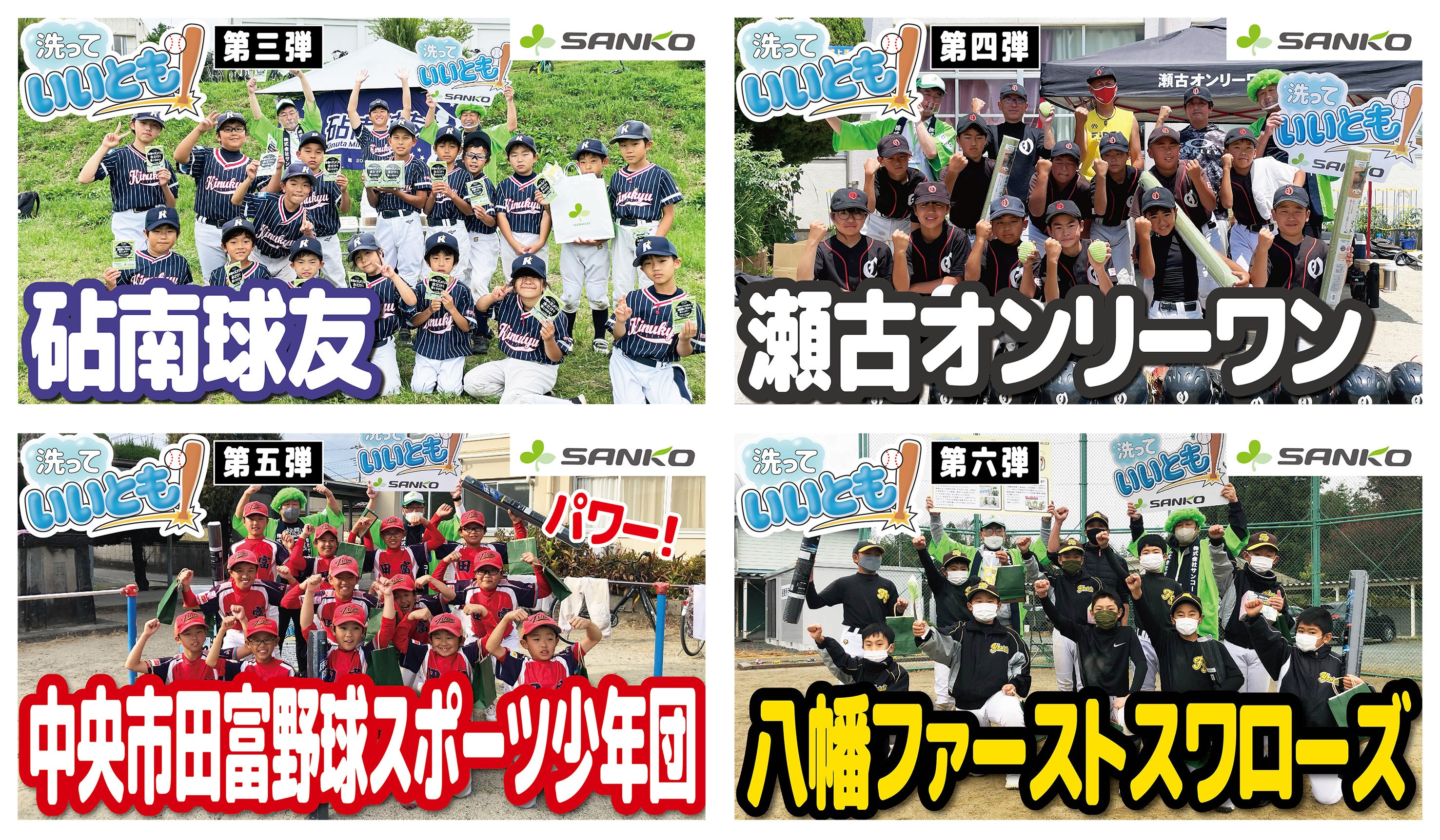 「洗っていいとも!」とは、野球をする子どもたちに、ユニフォームの予洗い方法をレクチャーしながら、心の成長をサポートするYouTube動画コンテンツです。様々な学童野球チームの監督・選手にご出演いただき、サンコー商品を使った簡単な汚れの落とし方のほか、「ツキを呼ぶ」方法をご紹介します。