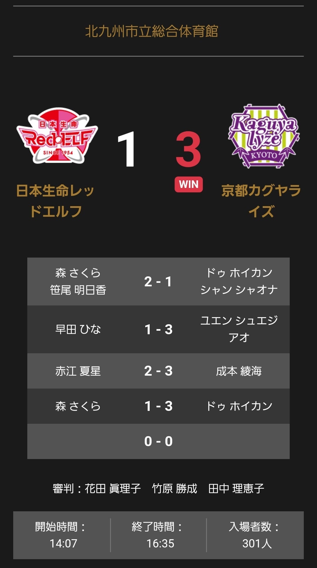京都カグヤライズが3-1で日本生命レッドエルフに勝利しました。