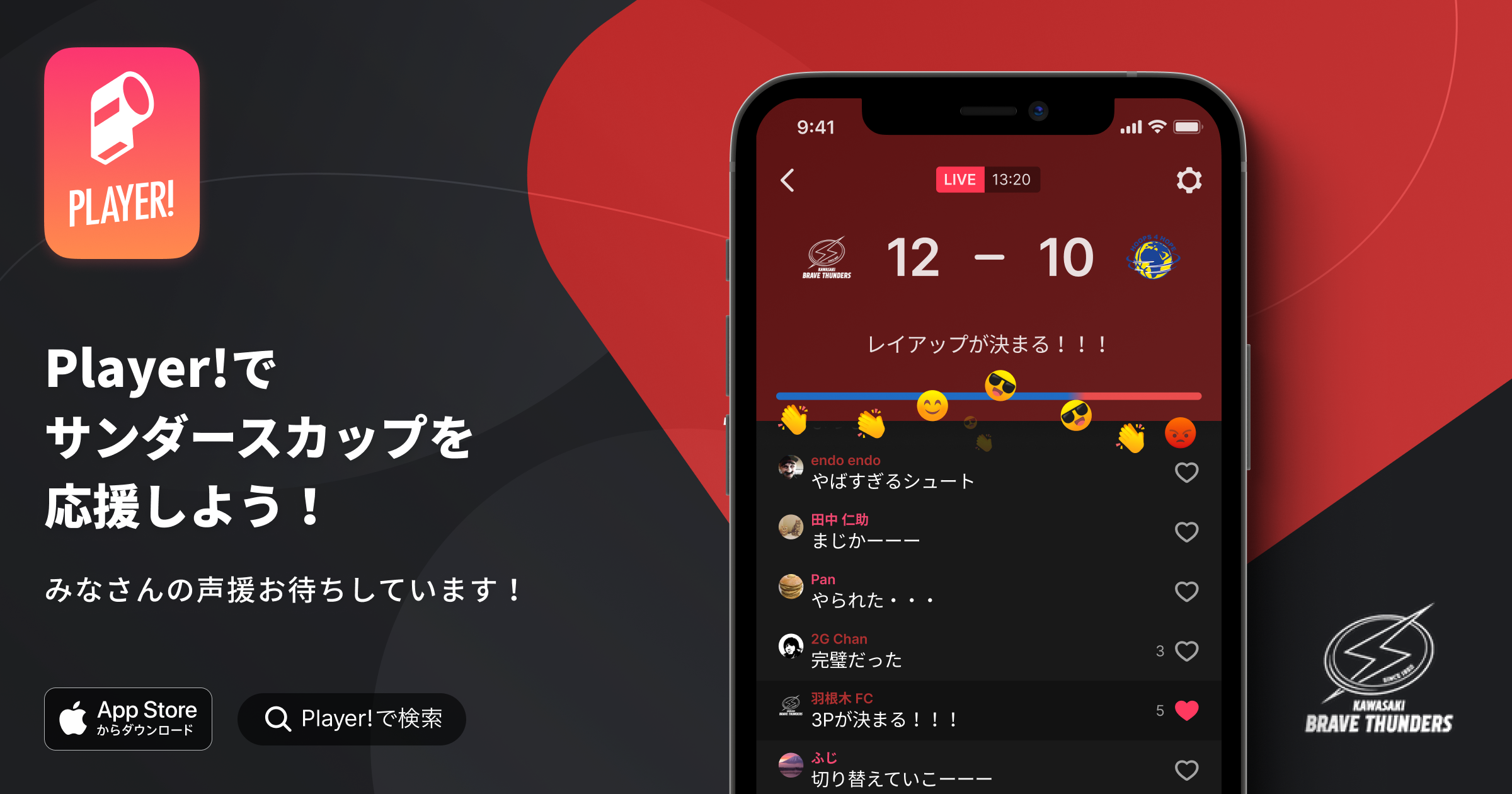 スポーツスタートアップ企業 ookami は、スポーツエンターテイメントアプリ「Player!」において、12/28(水)に川崎ブレイブサンダースが主催する U12 トレーニングマッチ、12/28-29にU15のサンダースカップにて リアルタイム速報を行うのと同時に、試合中の取り組みとして、以下を行います。