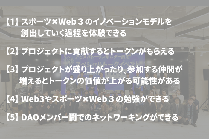 アビスパ福岡スポーツイノベーションDAOは特定の管理者が存在せず、アビスパ福岡と一緒に「福岡から世界に広がるイノベーションモデルを共創する」というビジョンに賛同したメンバー皆で意思決定し、行動することでプロジェクトを推進していく日本初のスポーツDAOとなります。