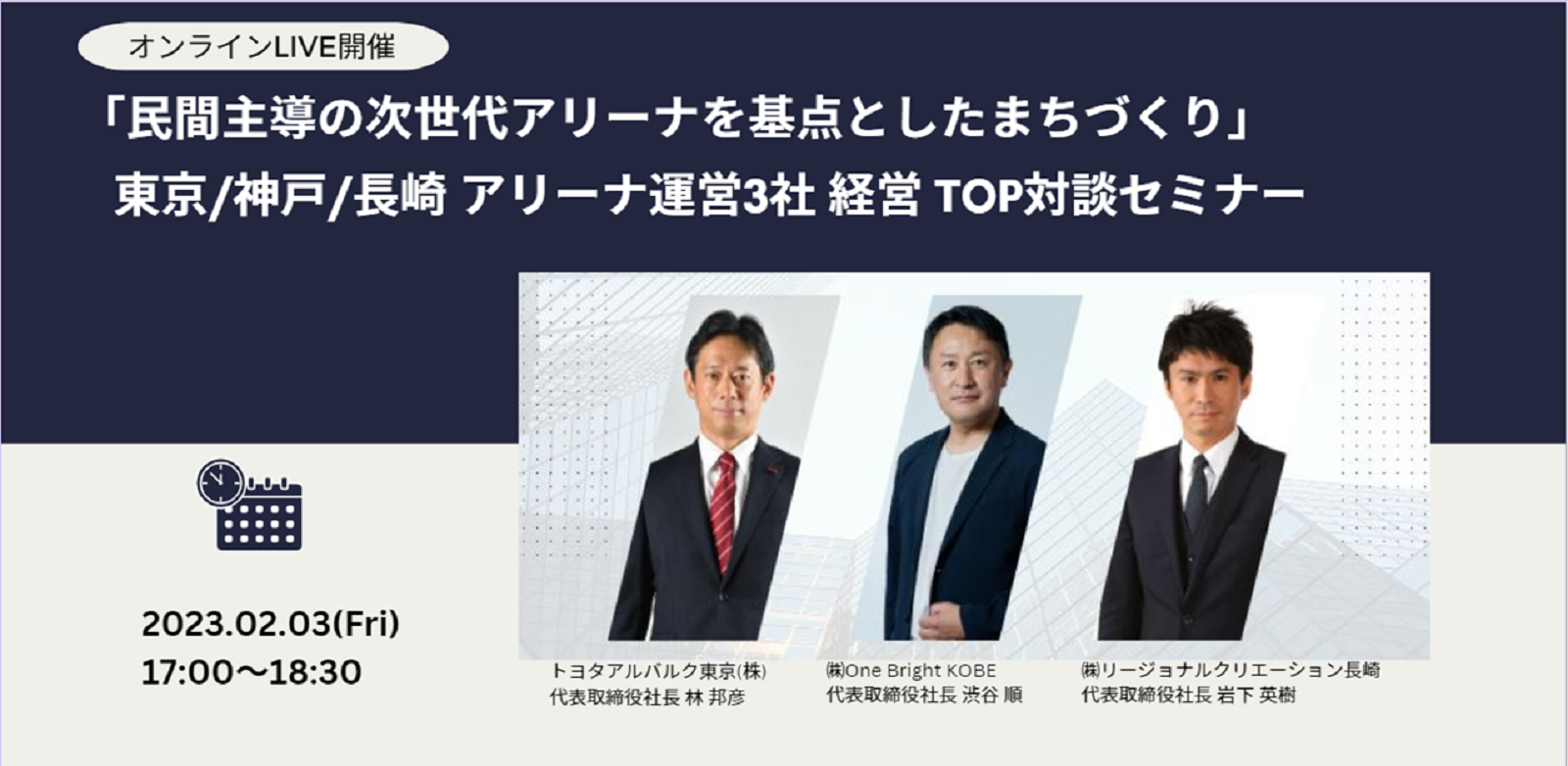 各アリーナは2025年度までに開業を予定し、B.LEAGUE(プロバスケットリーグ)のホームゲームをはじめ、スポーツイベントや音楽コンサート、MICE等多様なイベントに対応可能な施設を予定するほか、アリーナを基点にした観光需要の増加・地域のにぎわい創出への貢献を目指し、神戸・東京・長崎の各特性を生かした構想をTOP対談形式でお届けします。報道関係者の皆さま、プロジェクトにご関心のある企業・団体の皆さまのご参加をお待ちしております。