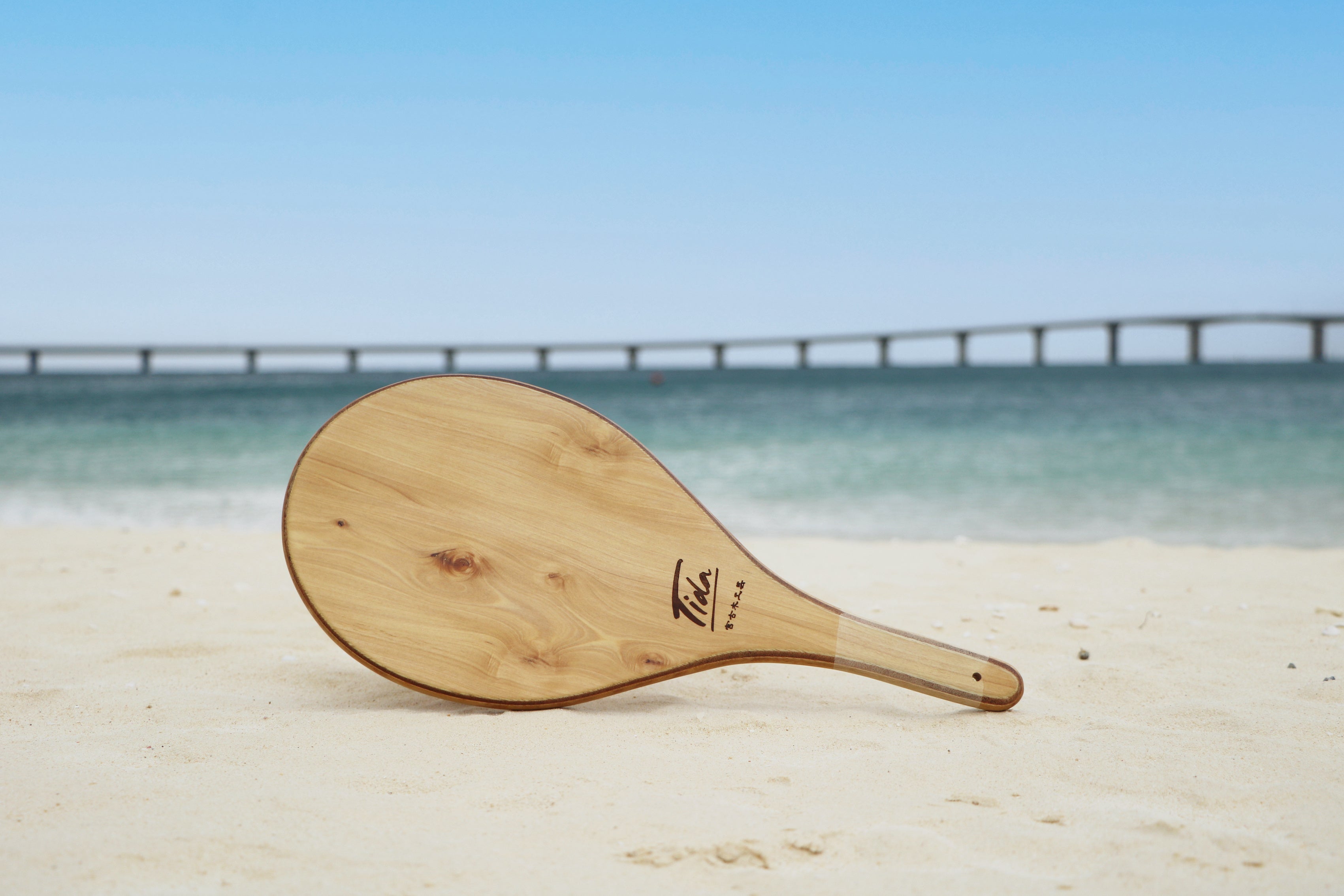 『TIDA-島変木-』は、全2種のラインナップを展開。一つは沖縄県産木「クスノキ」を用いたモデルで、強くて丈夫な材質を活かしたもの。耐久性にも優れ、強烈なアタックを繰り広げられる一本です。他方は沖縄県産木「センダン」を用いた子ども用モデル。木目が美しく、ほどよい固さ・軽さを兼ね備え、手の小さな子どもでも扱えるよう、一般的なラケットより一回り小さく改良されています。近年では、小学校の授業や学童クラブにおけるフレスコボールの導入も進み、まさに待望の一本となります。