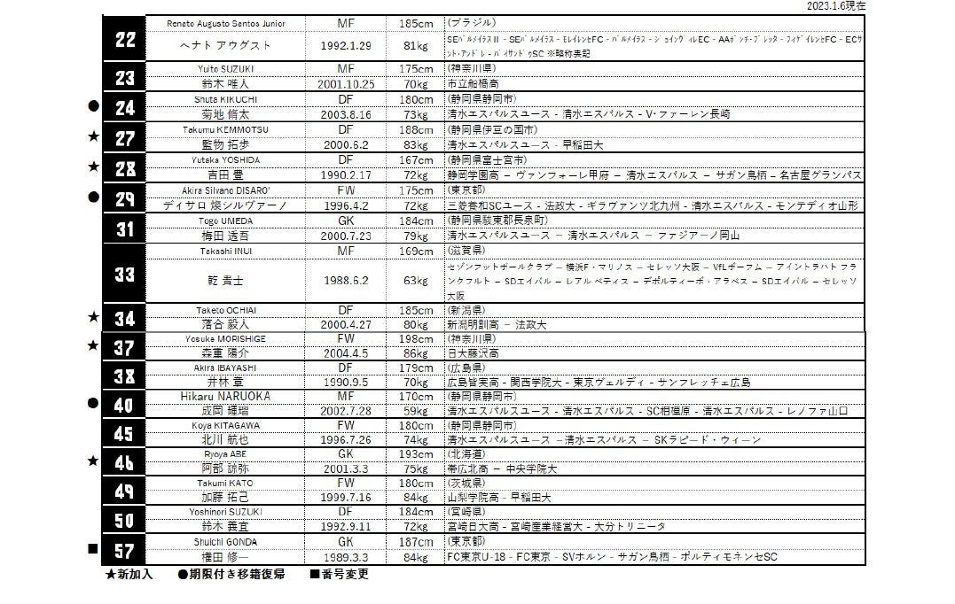 ホームプレスリリース 2023 シーズン トップチーム選手背番号決定のお知らせ 2023年01月06日 17時08分 公開|スポーツマニア編集部プレスリリース 清水エスパルスのプレスリリース このたび、2023 シーズン トップチーム選手の背番号が決定しましたので、下記の通りお知らせいたします。