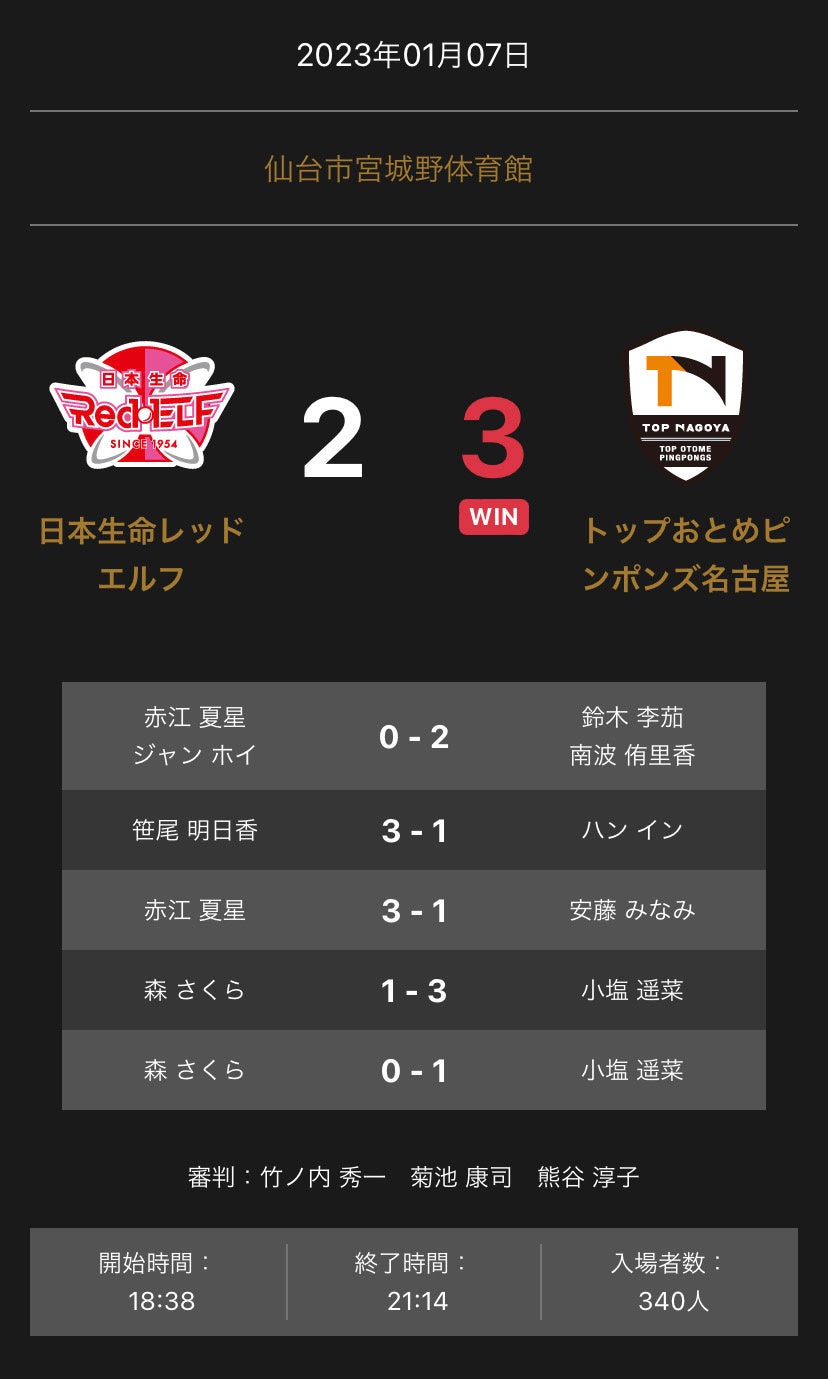 ホームプレスリリース ノジマTリーグ 2022-2023シーズン 公式戦 1月7日開催 日本生命レッドエルフ vs トップおとめピンポンズ名古屋 試合結果 2023年01月07日 23時08分 公開|スポーツマニア編集部プレスリリース 一般社団法人Tリーグのプレスリリース ノジマTリーグ 2022-2023シーズン 公式戦 1月7日に仙台市宮城野体育館(宮城県)にて開催された 日本生命レッドエルフとトップおとめピンポンズ名古屋の試合は、 3-2でトップおとめピンポンズ名古屋が勝利しました。