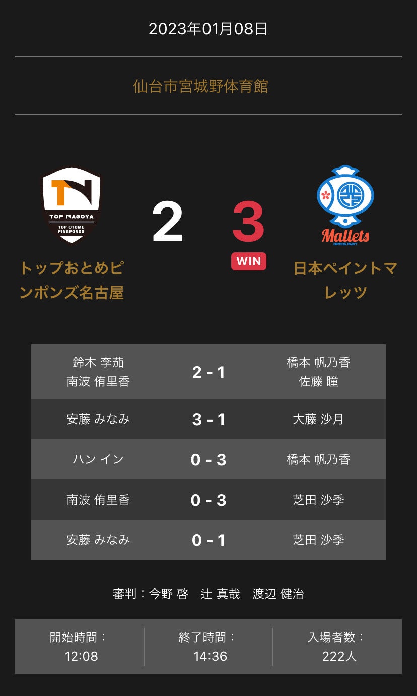 ホームプレスリリース ノジマTリーグ 2022-2023シーズン 公式戦 1月8日開催 トップおとめピンポンズ名古屋 vs 日本ペイントマレッツ 試合結果 2023年01月08日 17時08分 公開|スポーツマニア編集部プレスリリース 一般社団法人Tリーグのプレスリリース ノジマTリーグ 2022-2023シーズン 公式戦 1月8日に仙台市宮城野体育館(宮城県)にて開催された トップおとめピンポンズ名古屋と日本ペイントマレッツの試合は、 3-2で日本ペイントマレッツが勝利しました。