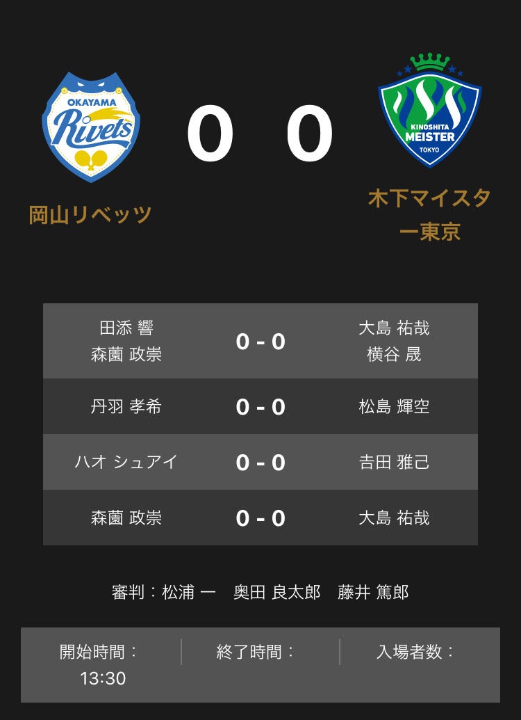 ホームプレスリリース ノジマTリーグ 2022-2023シーズン 公式戦 1月9日開催 岡山リベッツ vs 木下マイスター東京 オーダー発表 2023年01月09日 15時08分 公開|スポーツマニア編集部プレスリリース 一般社団法人Tリーグのプレスリリース ノジマTリーグ 2022-2023シーズン 公式戦 1月9日開催 会場:岡山シンフォニーホール 岡山リベッツ vs 木下マイスター東京 対戦オーダーが発表されました。 試合速報はこちらhttps://tleague.jp/schedule/detail.php?id=585