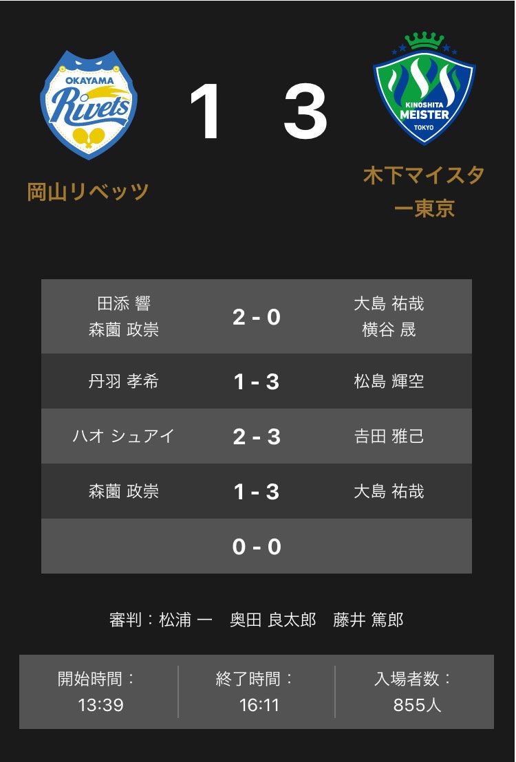 ホームプレスリリース ノジマTリーグ 2022-2023シーズン 公式戦 1月9日開催 岡山リベッツ vs 木下マイスター東京 試合結果 2023年01月09日 17時08分 公開|スポーツマニア編集部プレスリリース 一般社団法人Tリーグのプレスリリース ノジマTリーグ 2022-2023シーズン 公式戦 1月9日に岡山シンフォニーホールにて開催された 岡山リベッツと木下マイスター東京の試合は、 3-1で木下マイスター東京が勝利しました。