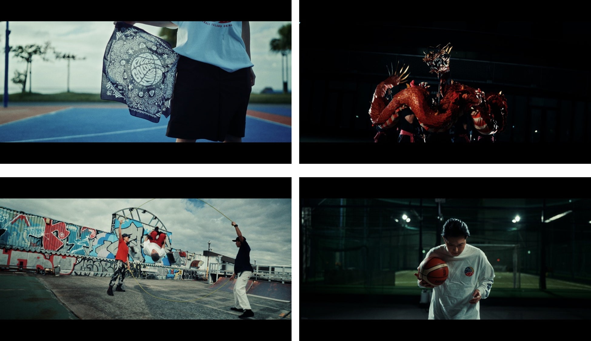 ムービーは夜のバスケットコートで、ストリートファッションに身を包んだ大のスニーカー好きで 知られる松也さんがご自身愛用のバッシュの紐を結び、バスケットゴールへ向かうシーンからスタート。着用している『ボールプリントロングスリーブTシャツ』のロゴにフォーカスが当たり、『ボールプリント Tシャツ』を着用し、バスケットコートでボールを手に佇むLicaxxxさんへオーバーラップ。『キャンプカラーシャツ』を着用したSHOHEYさんがスケートパークにてスケートボードを 颯爽と滑るシーンから舞台は沖縄へ。アラハビーチに隣接するオレンジとブルーで彩られた沖縄ならではのバスケットコートや、『バンダナ』にあしらった琉球ゴールデンキングスのチームロゴにも使われている龍を用いた舞を披露する“龍神伝説”など、沖縄のカルチャーへと繋がっていく。その龍をあしらった『金王籠球Tシャツ』を着用したダブルダッチチームREG☆STYLEのYUIさん、KEITA JUMPROCKさん、FLY DIGGERZのK-SKさんのストリートでの華麗なダブルダッチシーンへ。出演者と琉球ゴールデンキングスのホームアリーナである“沖縄アリーナ”がオーバーラップし、沖縄カルチャーとストリートシーンが融合していく。ムービーは夜のバスケットコートに戻り、松也さんのドリブルからシュートに向かう真剣な表情で締め括られる。