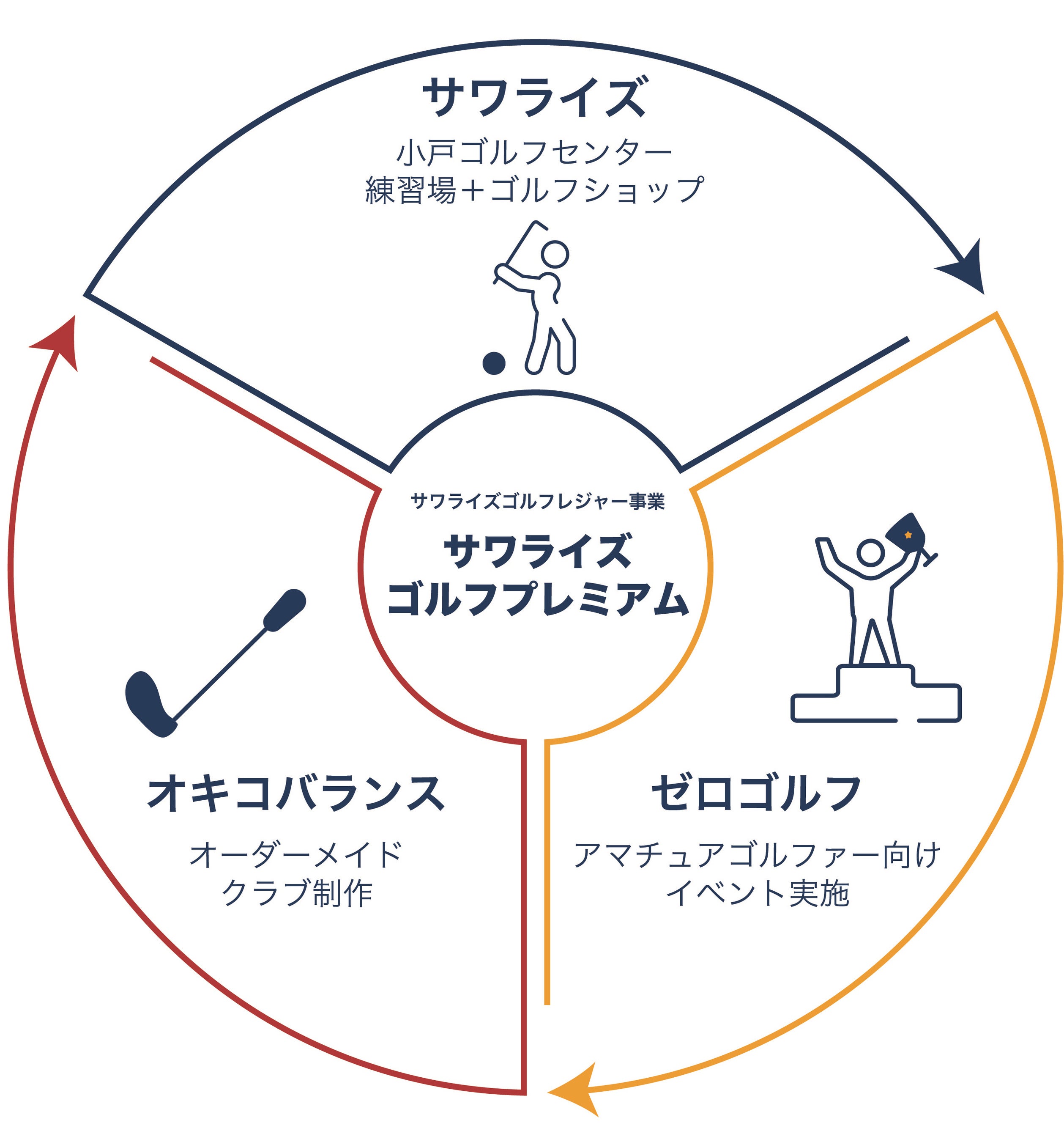 サワライズの3社連携でのゴルフレジャー事業では、契約ゴルファーによるテクニックや考えを学べるレッスン会や平均スコア100切りを目指すゴルファーに対してラウンドの経験を積むゴルフイベントなどを提供していく予定です。さらに、サワライズゴルフプレミアムとしての地クラブ開発と販売も予定しており、練習の場を提供するに留まらず、大会で成果を確認できる機会、スコア向上に繋がるクラブのフィッティングも含めたトータルでのゴルフレジャーを実現します。
