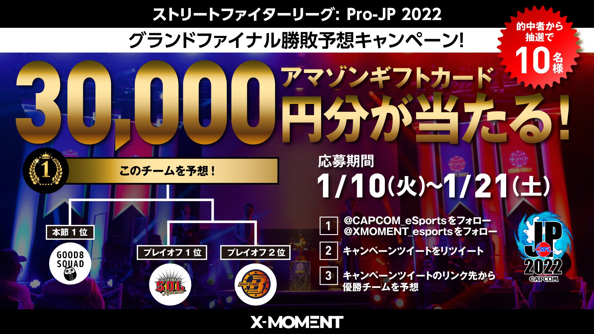 「ストリートファイターリーグ: Pro-JP 2022 グランドファイナル」の優勝予想チームをキャンペーン入力フォームで選択し、見事優勝チームを的中させた方の中から、抽選で10名様にアマゾンギフトカード 30,000円分をプレゼントします!