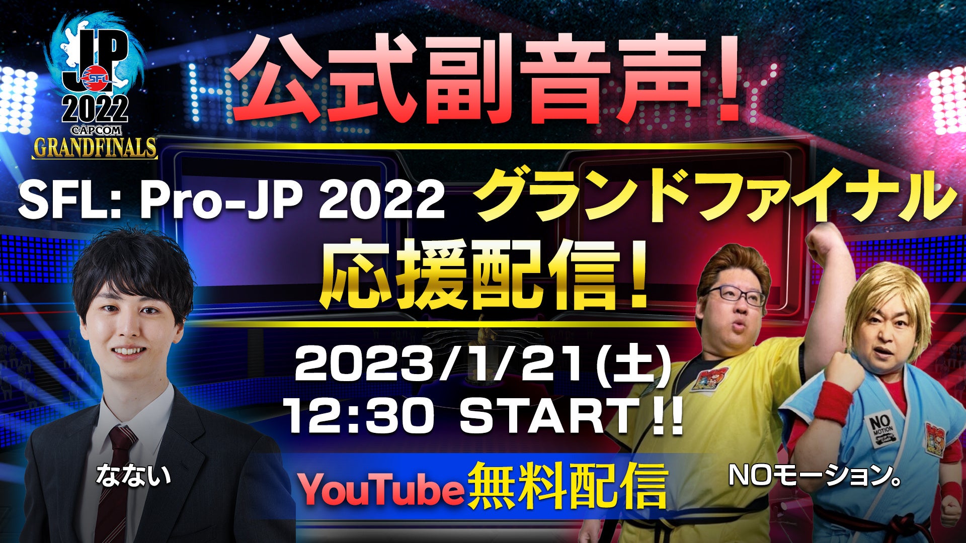 当日は、「CAPCOM Pro Tour 2022」日本語実況LIVE配信でもおなじみのNOモーション。のお2人と、 リーグ本節でも解説を担当した、なないさんが番組を盛り上げてくれます。