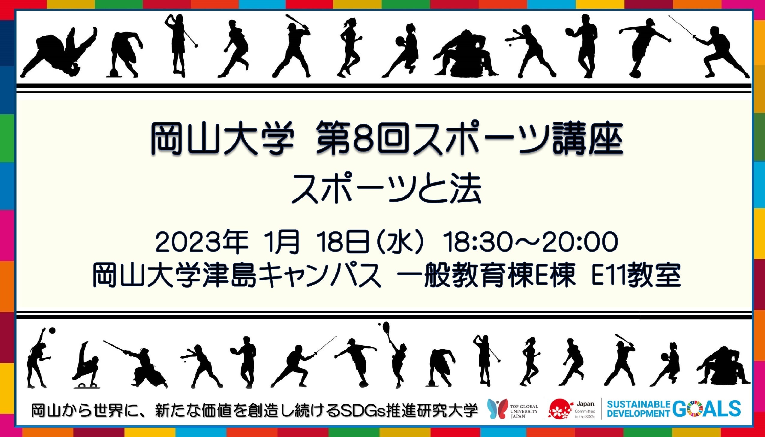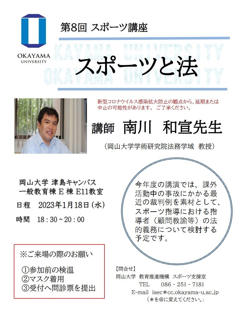 今回、第8回となるスポーツ講座「スポーツと法」を2023年1月18日(水)に岡山大学津島キャンパス(岡山市北区)にて開催します。