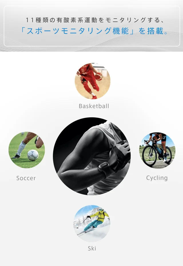 - 11種のスポーツに対応したモニタリングモードや睡眠モードなど多彩な機能。