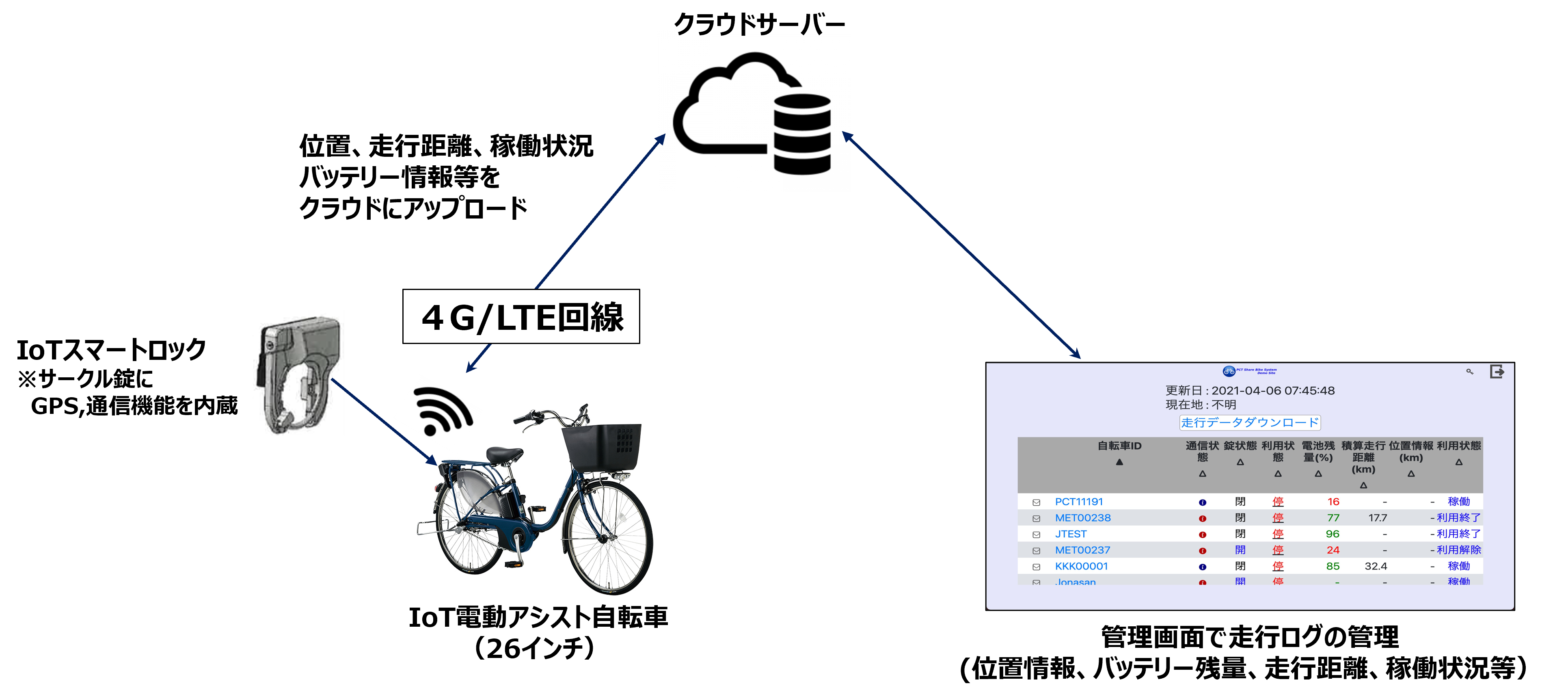 宗像市は脱炭素社会実現のため、2050年までに同市における二酸化炭素(CO2)排出量を実質ゼロにする「ゼロカーボンシティ」を宣言しています。しかしながら、マイカーを所有することが前提の暮らし方が定着し、短距離の移動においても自動車を使用することが常態化しているため、日常生活での移動におけるCO2排出量削減が課題になっていました。そこでこの度、当社製の電動アシスト自転車ショッピングモデル「ビビ・EX」をベースに、GPSと通信機能を内蔵する当社が独自で開発したIoTスマートロック搭載のIoT電動アシスト自転車10台を市民モニターに一定期間貸与。移動手段を自動車から電動アシスト自転車に変更することによるCO2削減量の算出や、GPSによる位置情報を、今回合わせて納入した管理ツールを用いて分析することで、利用状況の確認など、行動変容の可能性の検証を行います。