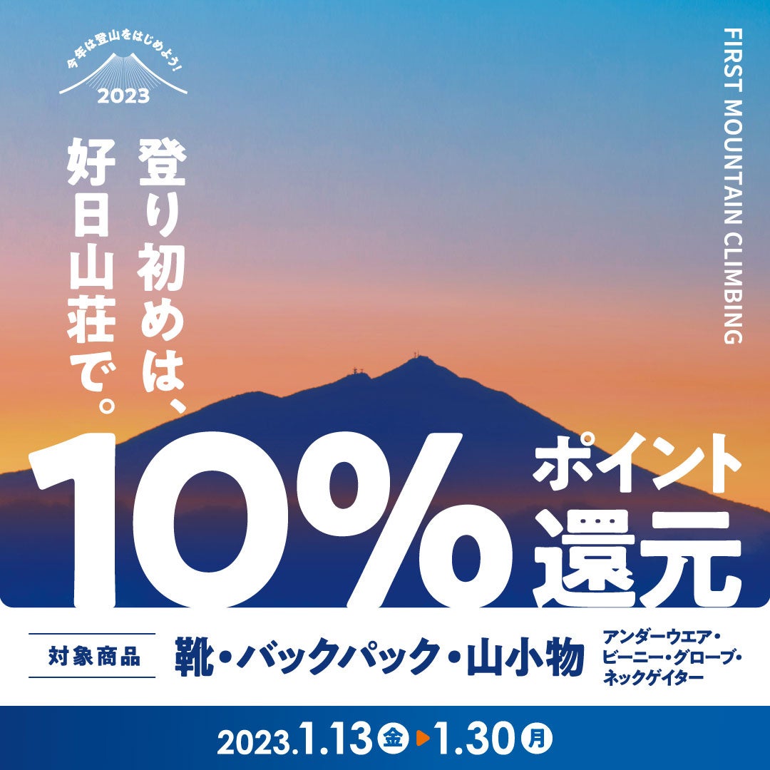 登山・クライミング・アウトドア用品総合専門店、クライミングジムを運営する株式会社好日山荘(本社:兵庫県神戸市、代表取締役社長 松本 良一)は、1月13日(金)から30日(月)の間、好日山荘全店(フランチャイズ店含む)で、靴・バックパック・帽子・グローブ・ネックゲイター・アンダーウェアがメンバーズポイント10%還元となる「登り始めは、好日山荘で。」を開催します。