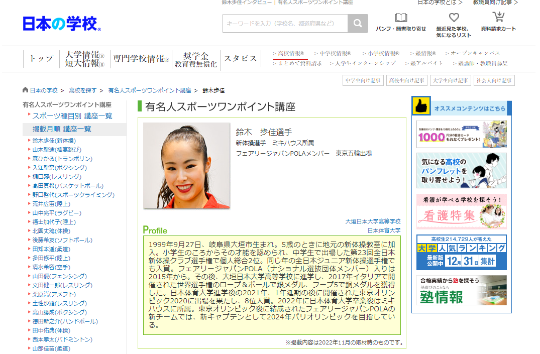 全国の大学・短大・専門学校などの学校情報を提供する、株式会社JSコーポレーション「⽇本の学校」では、注目のプロアスリート選⼿の学⽣時代の取り組みや、練習⽅法・⼼構えに関するアドバイスの他、⾼校⽣に向けた熱い応援メッセージを掲載しています。