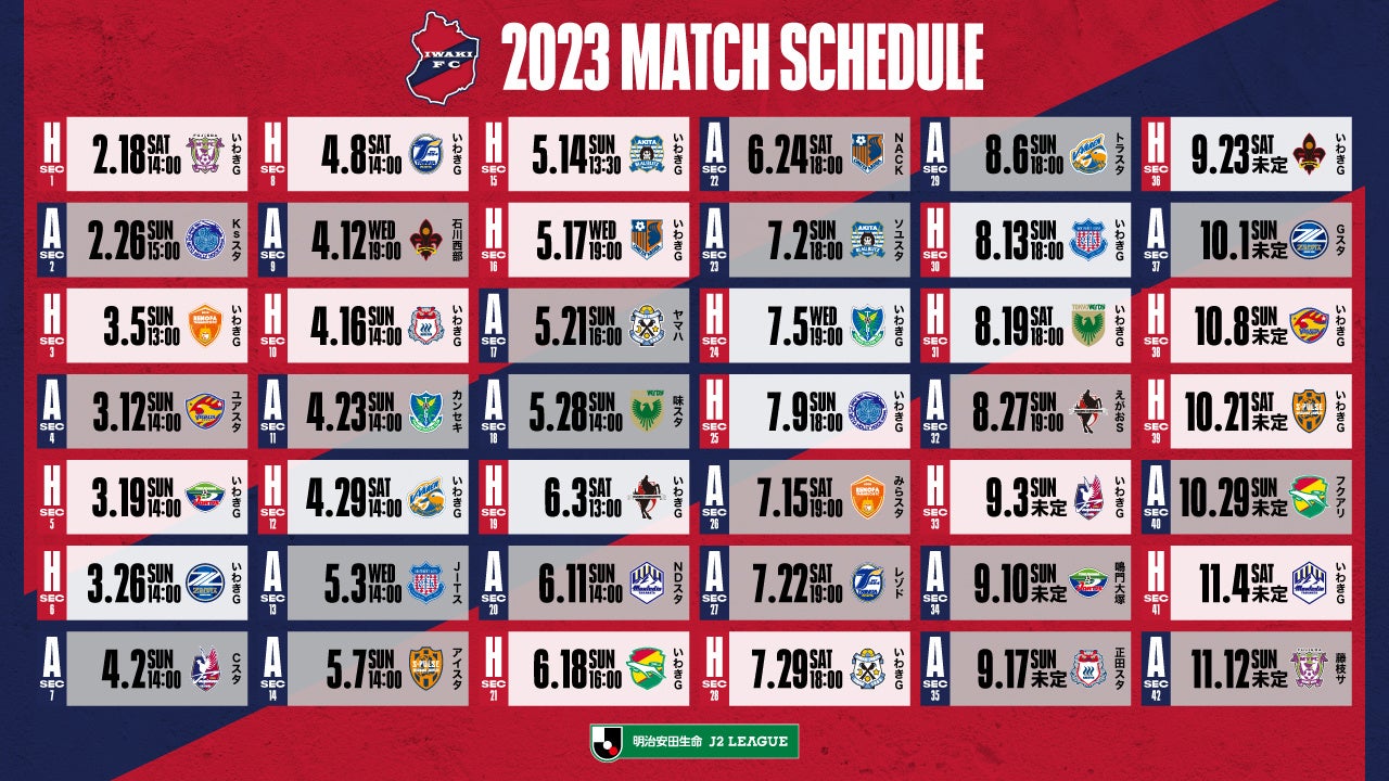 このたびいわきFCは、2023 明治安田生命J2リーグにおける8月までの試合日程が決定しましたので、お知らせいたします。9月以降の試合日程に関しては、開催日・対戦カード・スタジアムのみの発表となります。