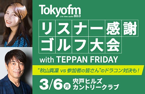 TOKYO FMで毎週金曜日に放送中の中西哲生がパーソナリティをつとめる『TOKYO TEPPAN FRIDAY supported by Ginza Sony Park』(金15:00~17:00)では、番組初のイベント「TOKYO FMリスナー感謝ゴルフ大会 with TEPPAN FRIDAY 中西哲生」を2023年3月6日(月)、宍戸ヒルズカントリークラブ(茨城県笠間市)にて開催いたします。ゴルフが大好きな同番組パーソナリティの中西哲生に加え、毎週土曜日に放送中の女子プロゴルファー応援番組「アース製薬dream shot輝けゴルファー」パーソナリティー秋山真凜も参加いたします。秋山真凜 vs 参加者の皆さんのドラコン対決、プレー後は中西哲生と秋山真凜が司会をつとめるパーティーも開催。参加申し込みは(https://www.tfm.co.jp/2303golf/)から。応募締め切りは2月20日(日)となります。