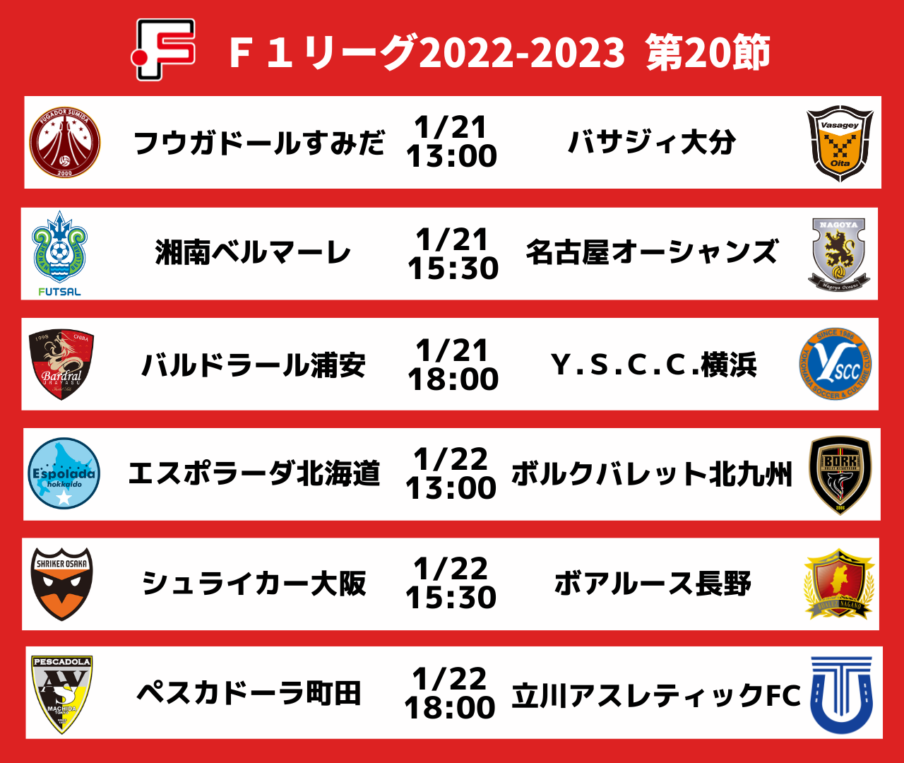 1月21日(土)、22日(日)にFリーグ2022-2023 ディビジョン1 第20節の6試合を開催いたします。